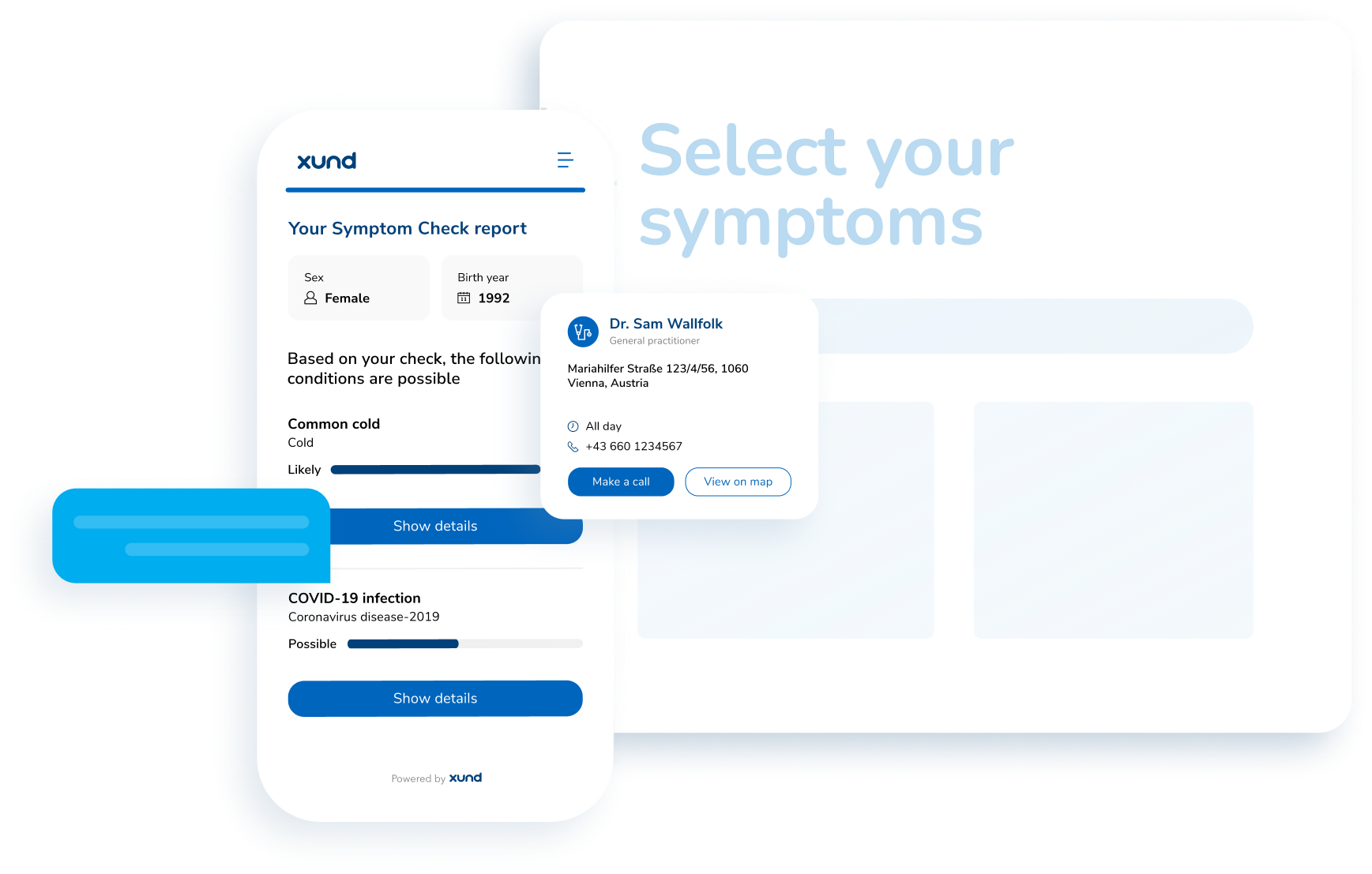 Leveraging the data from the modules, the Patient Interaction Suite presents relevant treatment pathways tailored to each individual. These pathways may include recommendations for local General Practitioners (GPs) or specialists, nearby pharmacies, or digital health solutions. As the range of available healthcare providers varies from country to country, XUND adapts the recommendations to suit each patient's specific location and needs. This ensures that patients receive personalized and localized healthcare options, optimizing their journey toward better health outcomes.